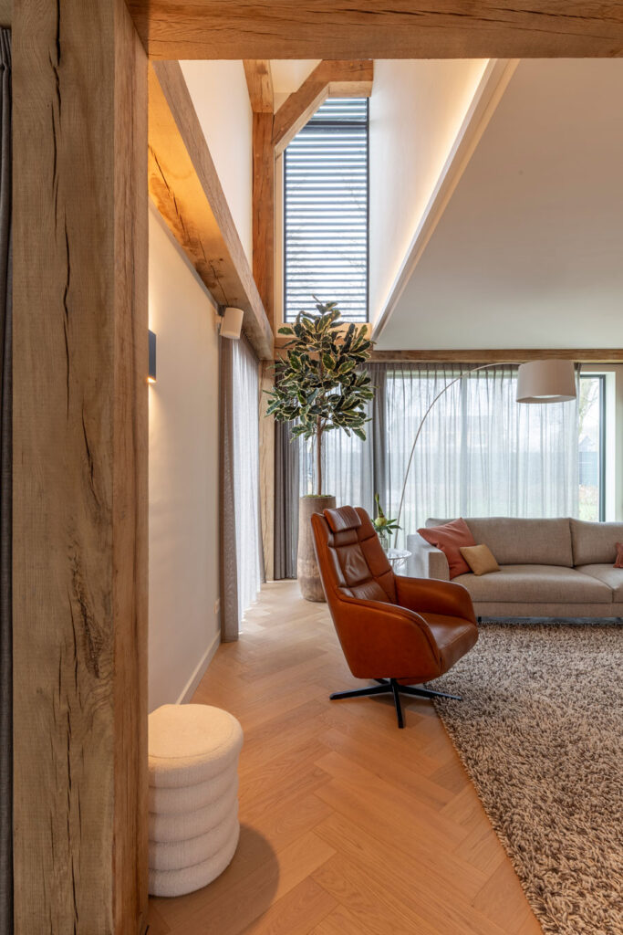 Binnen vormt de eikenhouten hoofdconstructie het warme hart van het interieur. Royale vides en open zichtlijnen zorgen voor een dynamische verbinding tussen de verschillende ruimtes, elk met een eigen karakter, maar in harmonie met elkaar.